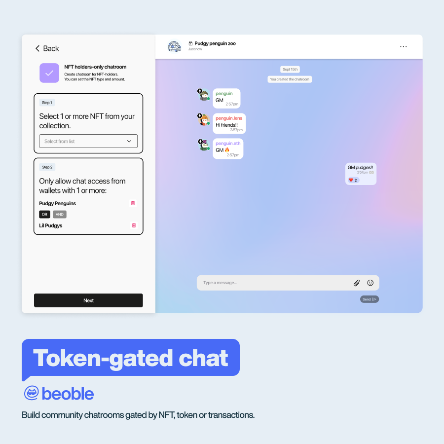 So many things are about access control in Web3, and we make it super easy via our token-gated / transaction-gated chatrooms. Below are some examples of what you can do in beoble.